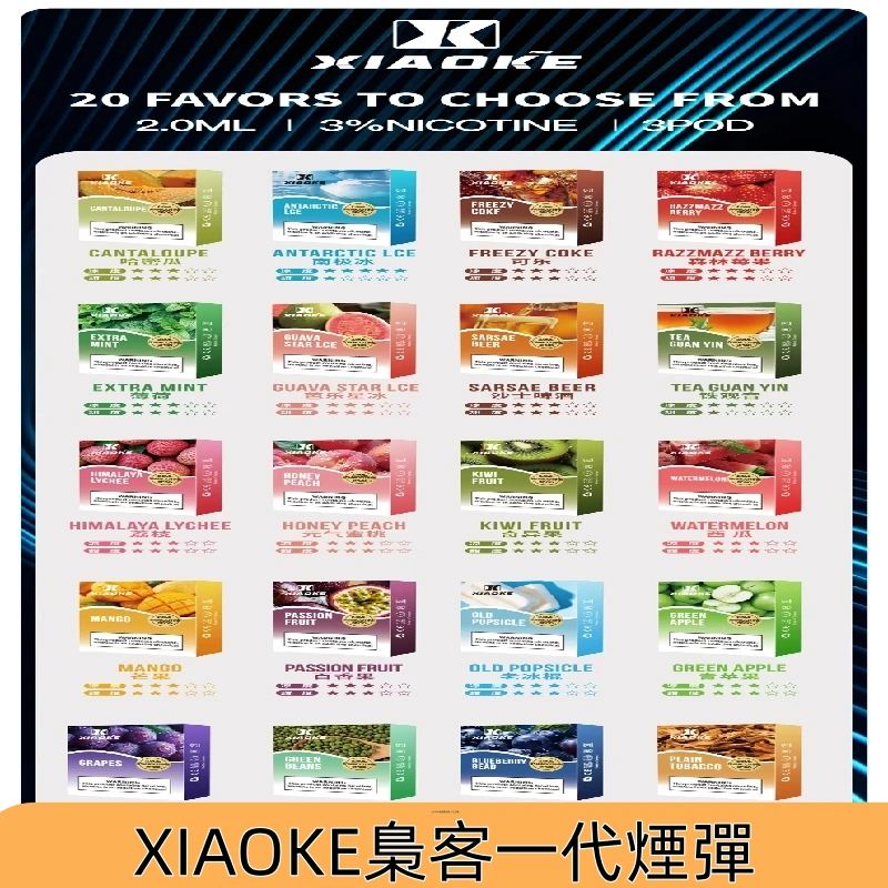 - 20種口味:從高涼度到低涼度不同涼度口味,XIAOKE梟客一代煙彈都能滿足到客戶不同的味蕾。